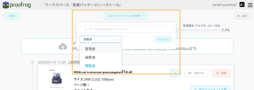 ・管理者 : ファイルの削除やワークスペースの設定変更ができます