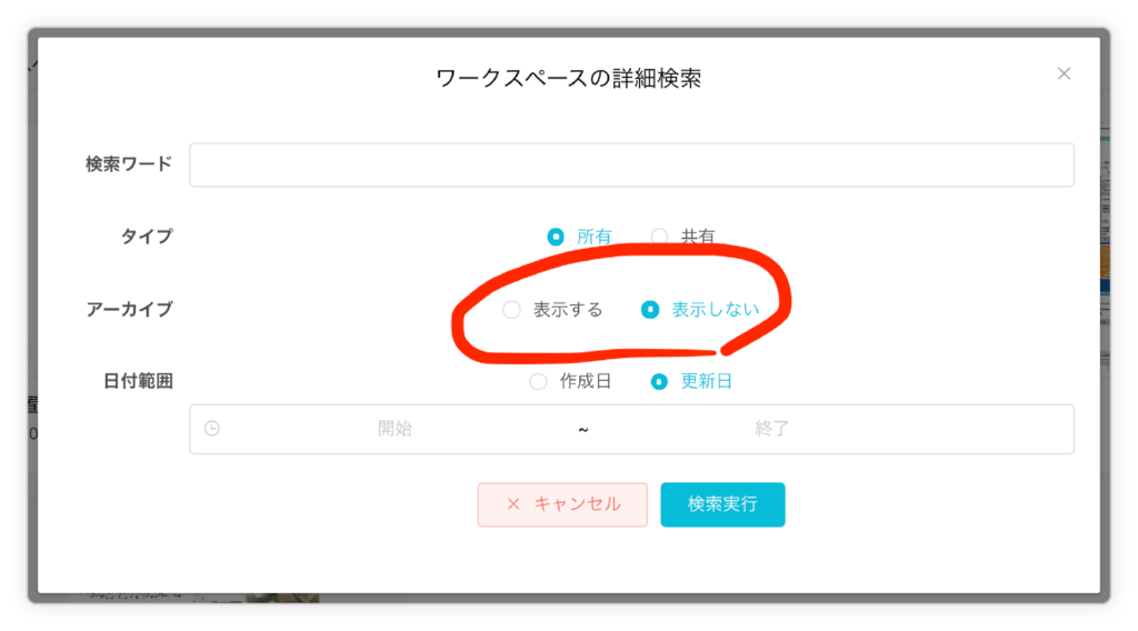 ワークスペースの詳細検索にアーカイブの項目があるので、「表示する」を選択して検索実行することで、アーカイブしたワークスペースを一覧表示することができます。
